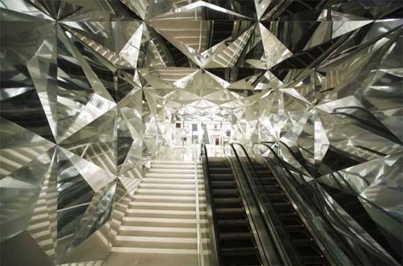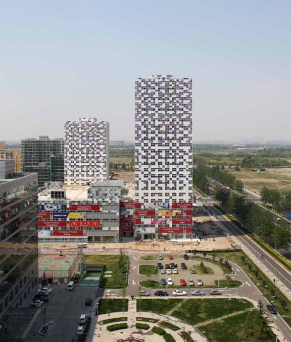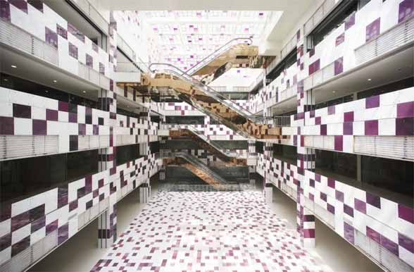 這是一棟位於北京的綜合開發大樓,由日本建築師Keiichiro SAKO設計。低樓層部分是大型商業賣場,高樓層是一般住宅空間。設計的概念就是馬賽克,建築師希望藉由小單元拼湊的視覺效果帶來豐富的空間變化,從立面衍伸至室內設計,讓空間原本的單一性更富有趣味。