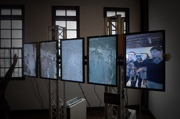 昨天去了一趟萬華剝皮寮,看了在那舉辦的"數位藝術展"逛了一圈,難掩失望的神情...可能是對於數位兩個字的期望過高...在下認為或許應該更名為數位媒材展。不過還是有收穫,以下這組裝置,就是上課討論的利用鏡頭攝取影像,然後套入設定的解析度高低來造成馬賽克的效果。