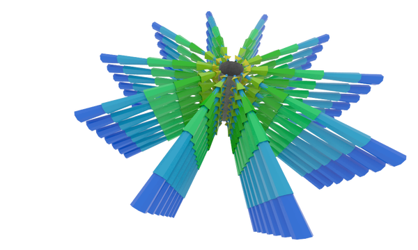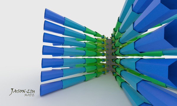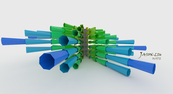 這次的練習是藉著管狀物離中心延伸的距離來控制一些變化變化的因素有1.開口的變形,由三角形轉換成八邊形2.旋轉的角度3.顏色 (不過在ren圖的時候無法顯示,有待確認)